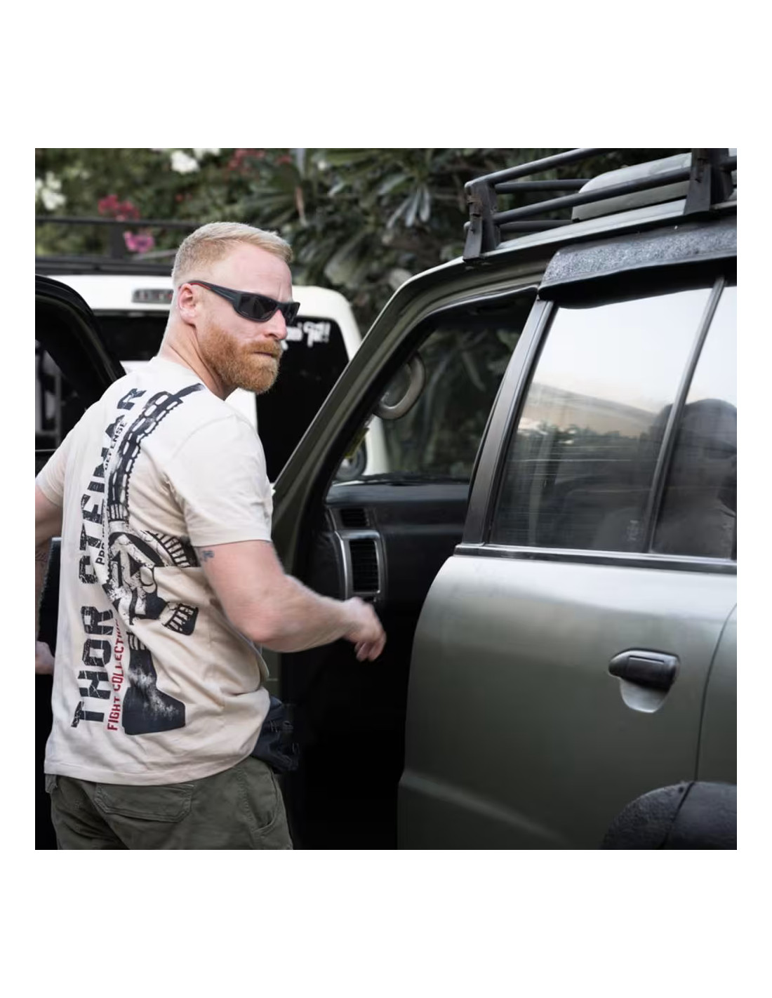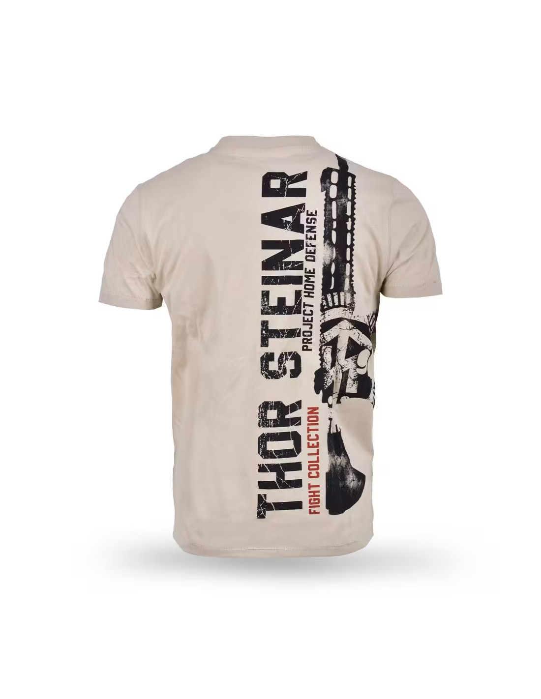 • Zadná strana: vertikálne rozložená potlač “THOR STEINAR – Project Home Defense” v opotrebenej bielej, doplnená mohutnou päsťou a šípmi, červený akcent “Fight Collection”