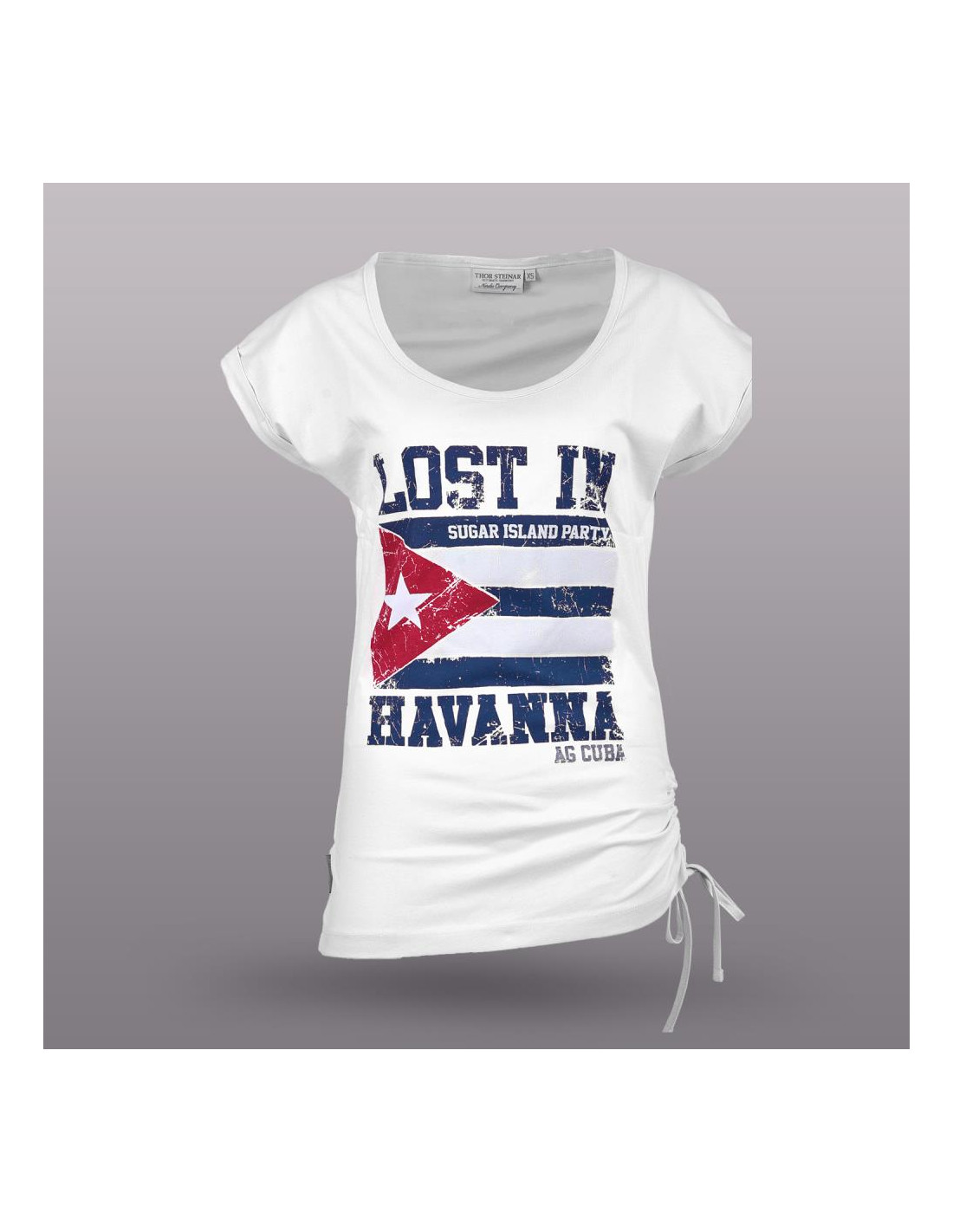 Motív kubánskej vlajky v modro-bielo-červenom prevedení, doplnený textom „LOST IN HAVANNA“ a „SUGAR ISLAND PARTY AS CUBA“