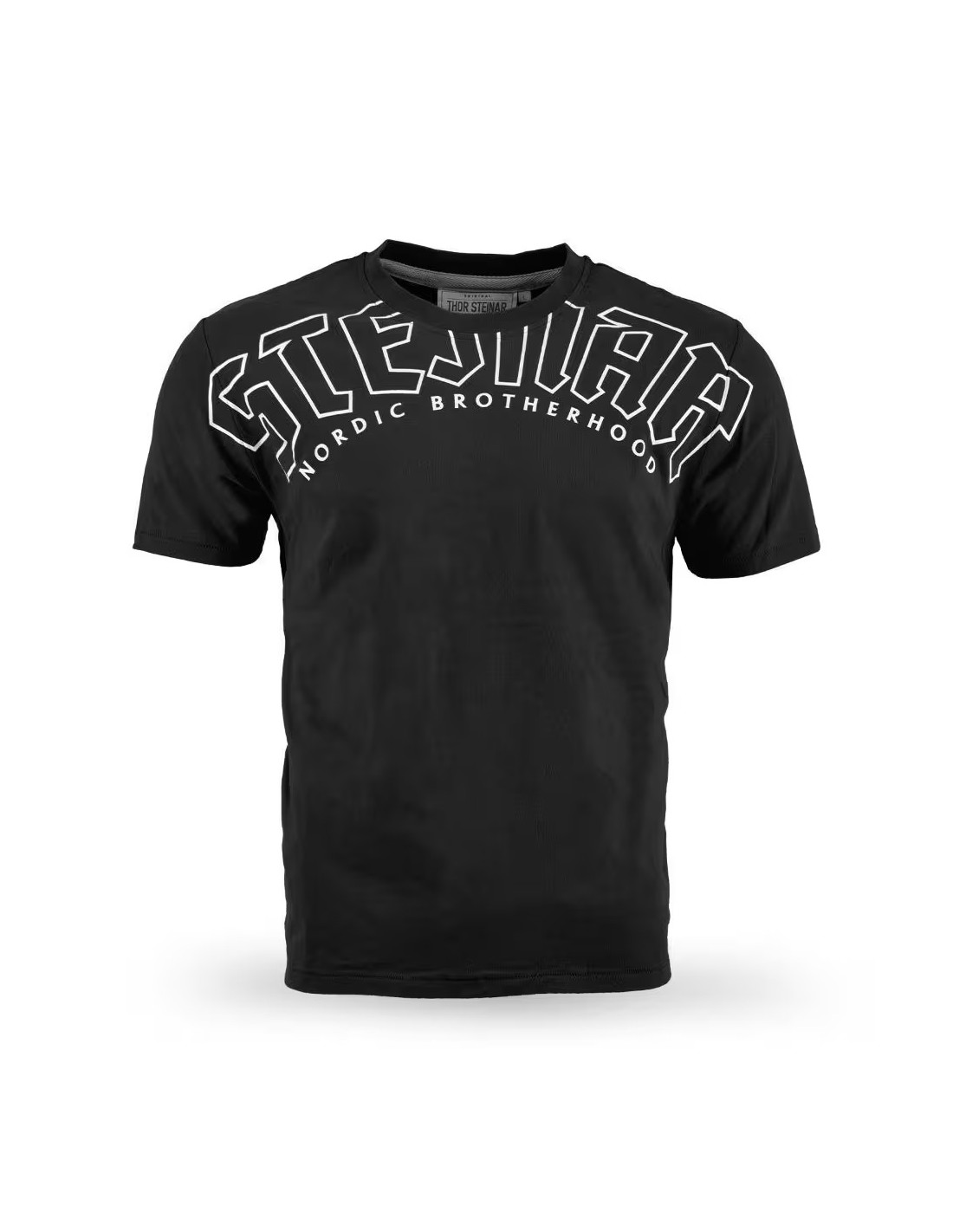 - Výstrih a detaily: Tričko má štandardný okrúhly výstrih. Z vnútornej strany v oblasti zadného krku je viditeľná sivá lemovka a všitý textilný štítok s logom a názvom značky Thor Steinar.