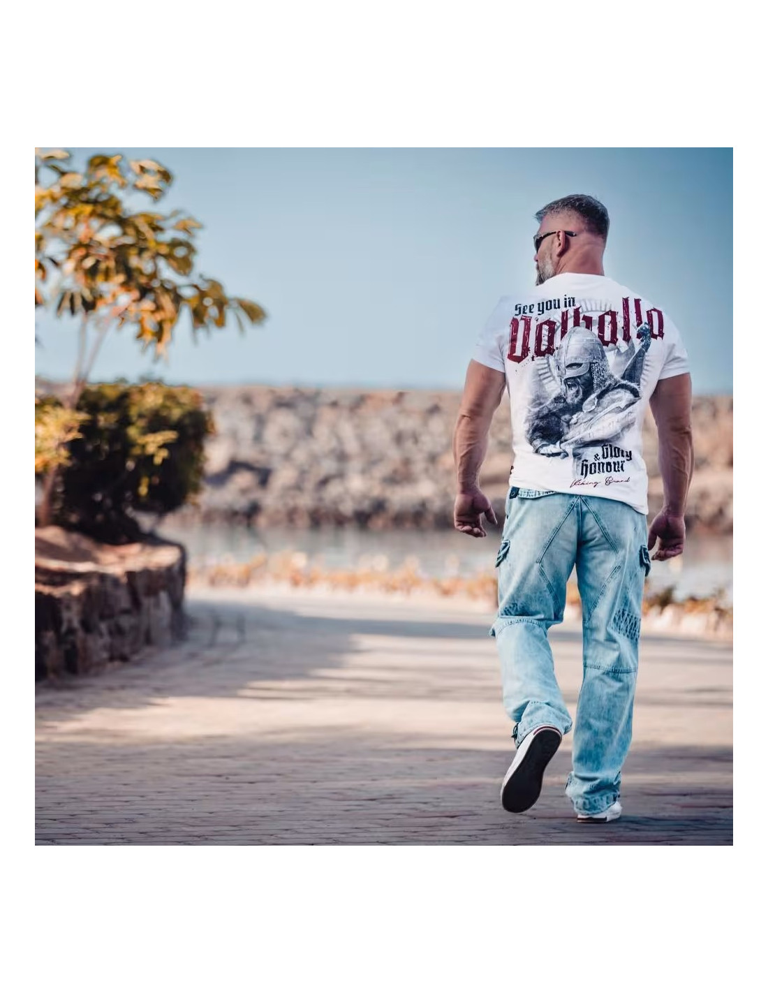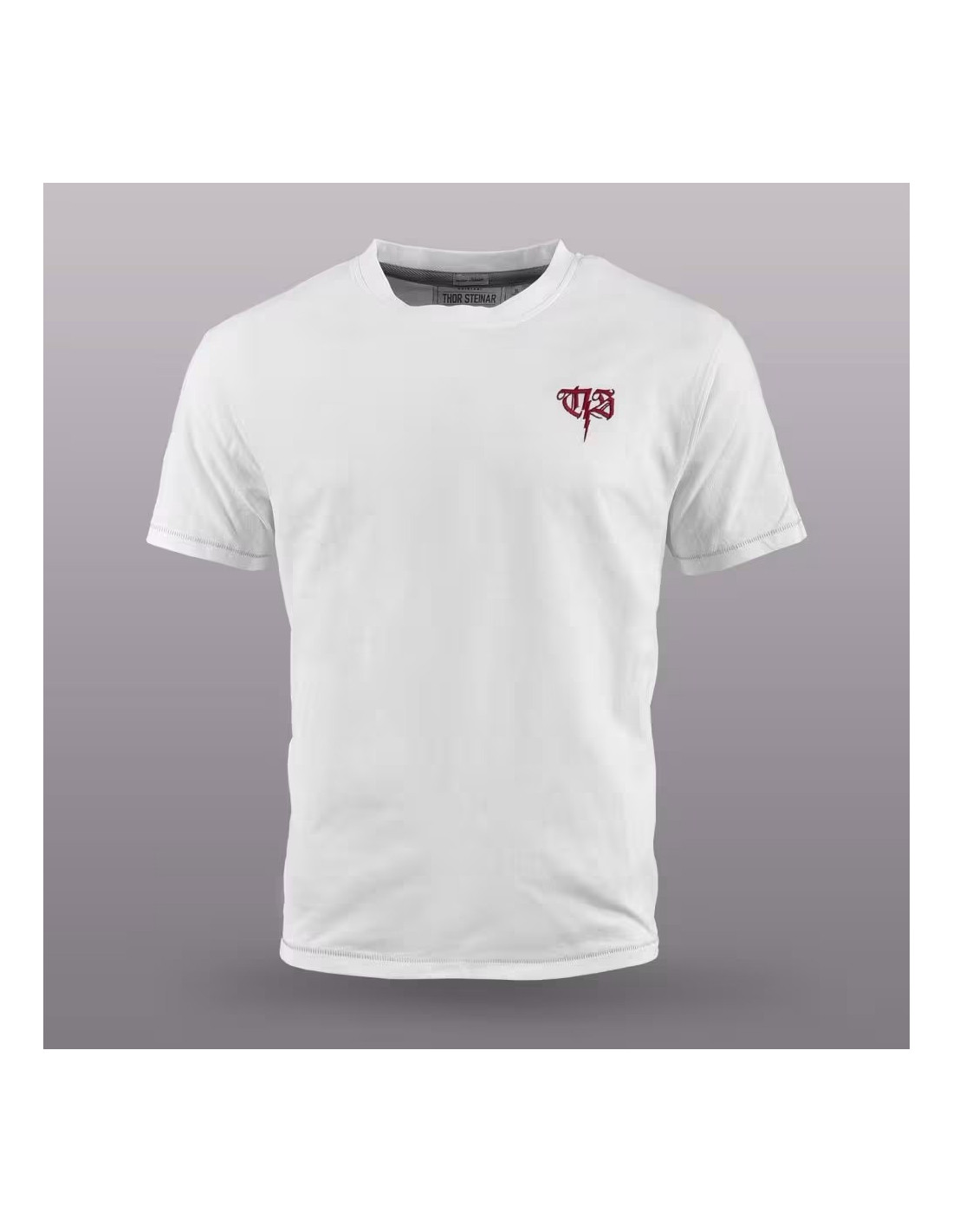 • Výstrih a detaily: Tričko má štandardný okrúhly výstrih. Z vnútornej strany v oblasti zadného krku je viditeľná sivá lemovka a všitý textilný štítok s logom a názvom značky Thor Steinar.