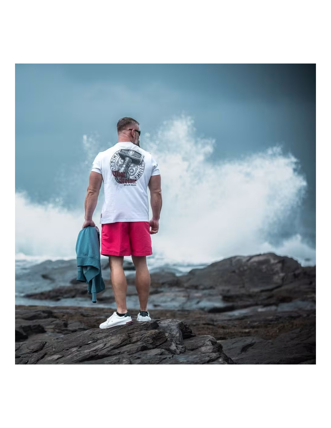 • Hlavný grafický motív: Celej zadnej časti dominuje veľká, detailne prepracovaná potlač. Ústredným prvkom je masívne Thorovo kladivo (Mjölnir) s 3D textúrou, ktorá pripomína opracovaný kameň. Na hlave kladiva je vyobrazený malý erbový štít.