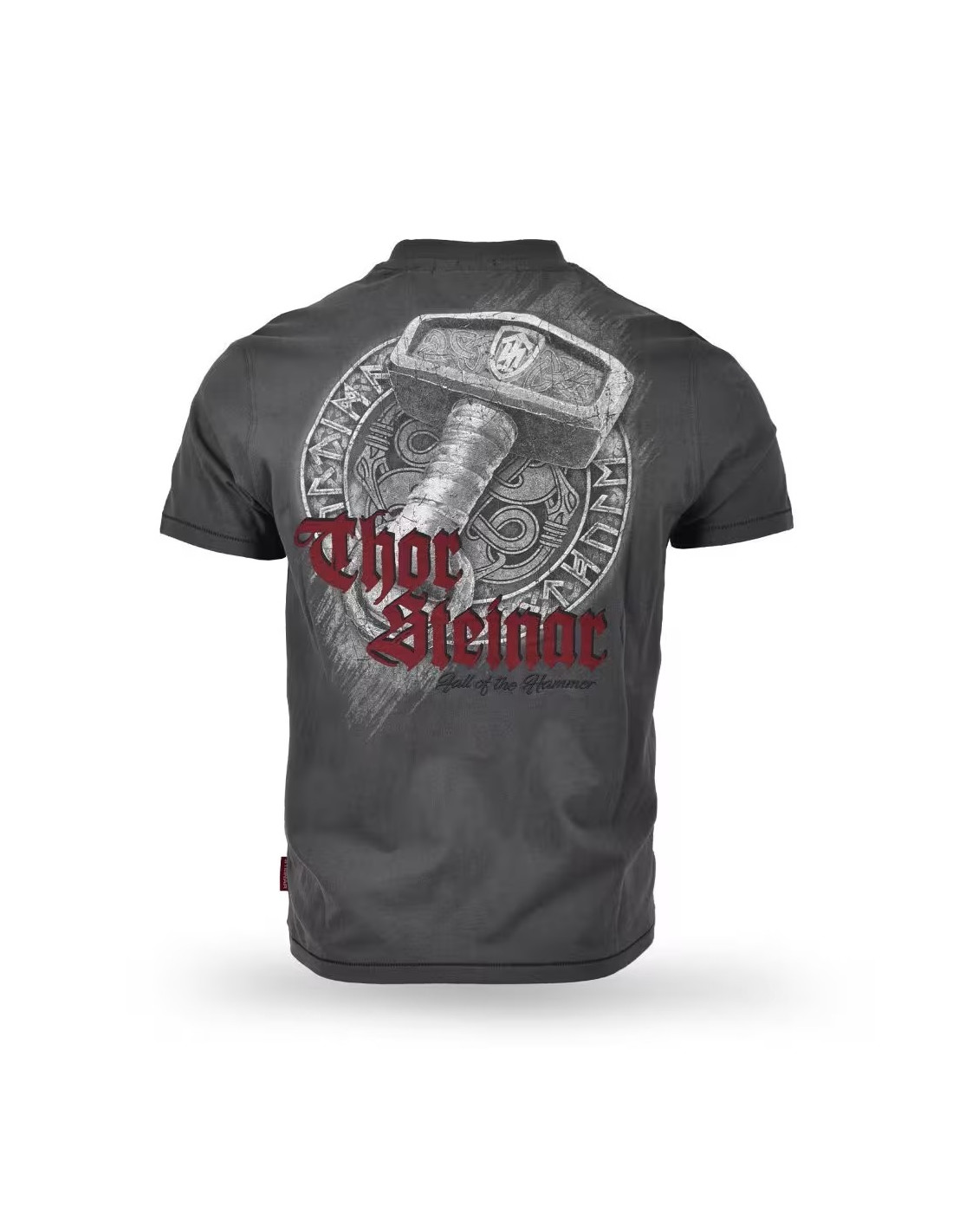 • Pozadie motívu: Za kladivom sa nachádza kruhový kamenný disk, ktorý je bohato zdobený tradičnými severskými prepletanými vzormi a po obvode sú vytesané runy. Okraje celej grafiky sú "rozpité" a tónované do tmavej (grafitovej) farby, vďaka čomu plynule prechádzajú do podkladu trička.