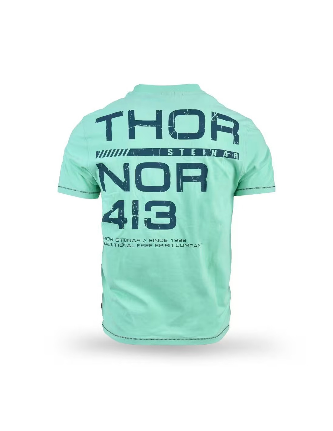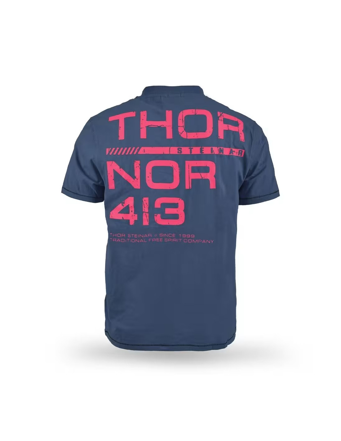 Tričko má štandardný strih s viditeľným dekoratívnym prešívaním na spodnom okraji a rukávoch. Vzhľadom na symboliku značky Thor Steinar a kombináciu nápisov (ako „NOR“ a číslo „413“) ide o dizajn inšpirovaný severskou tematikou.