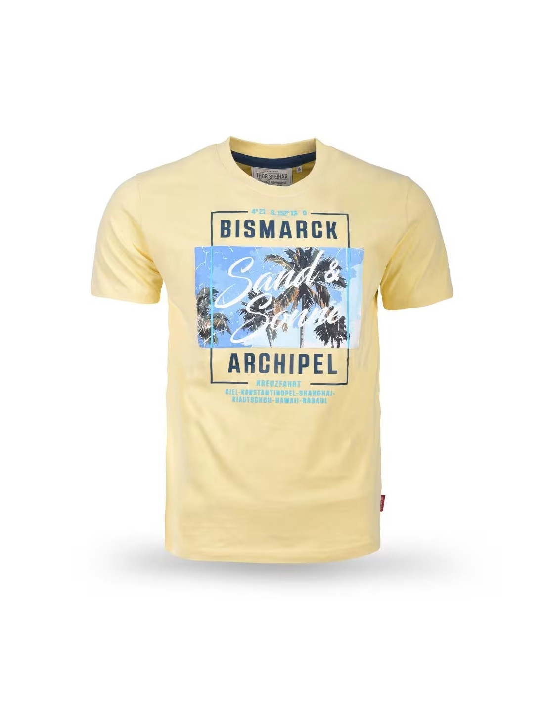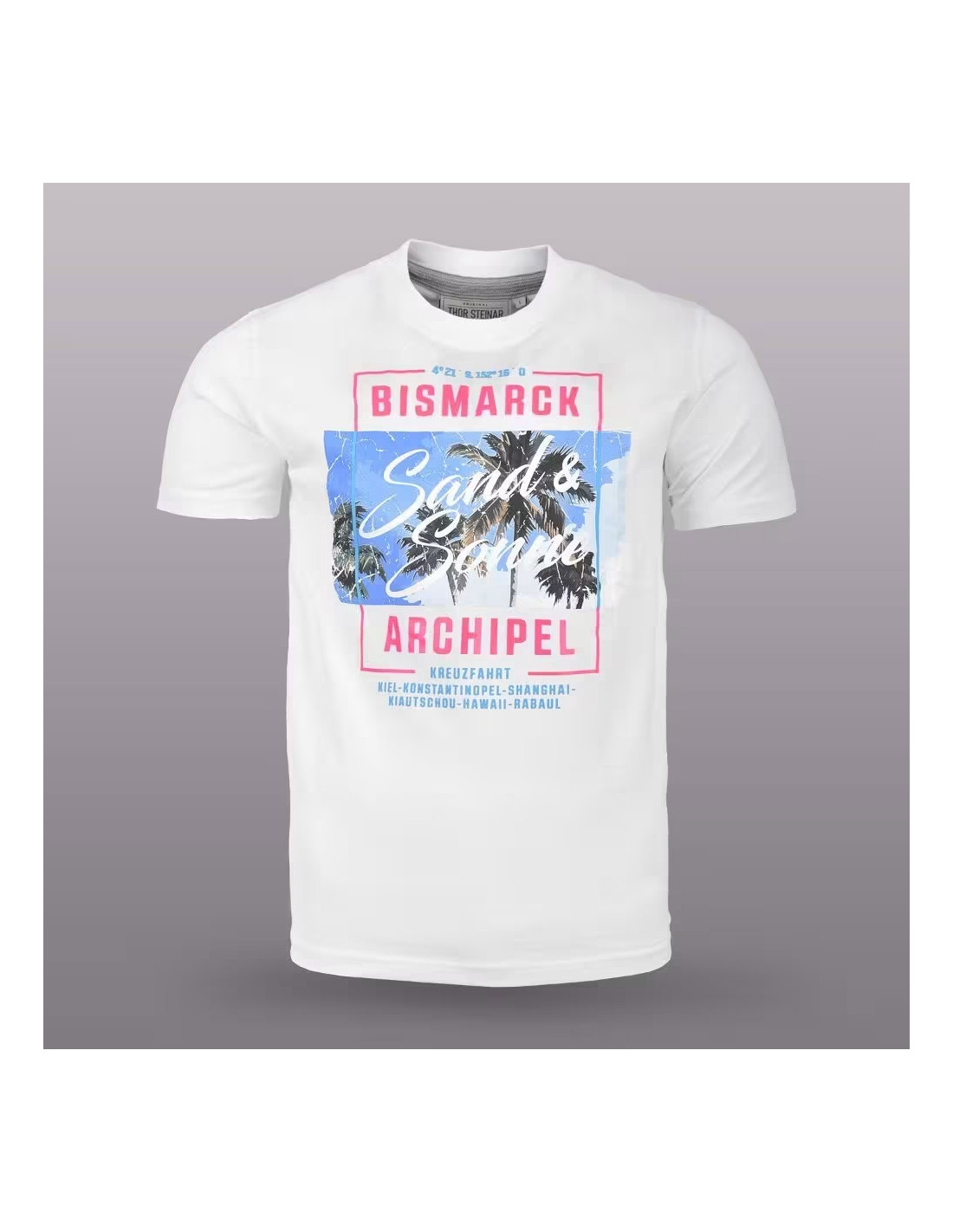 Thor Steinar prináša letné osvieženie v podobe trička, ktoré vás prenesie do tichomorských diaľav. Motív „Bismarck Archipel“ s nápisom „Sand & Sonne“ (Piesok a Slnko) kombinuje drsnú identitu značky s tropickou estetikou. Výrazná grafika s palmami na svetlomätovom podklade je ideálnou voľbou pre každého, kto chce vystúpiť zo šedi mesta a vniesť do svojho outfitu poriadnu dávku energie.