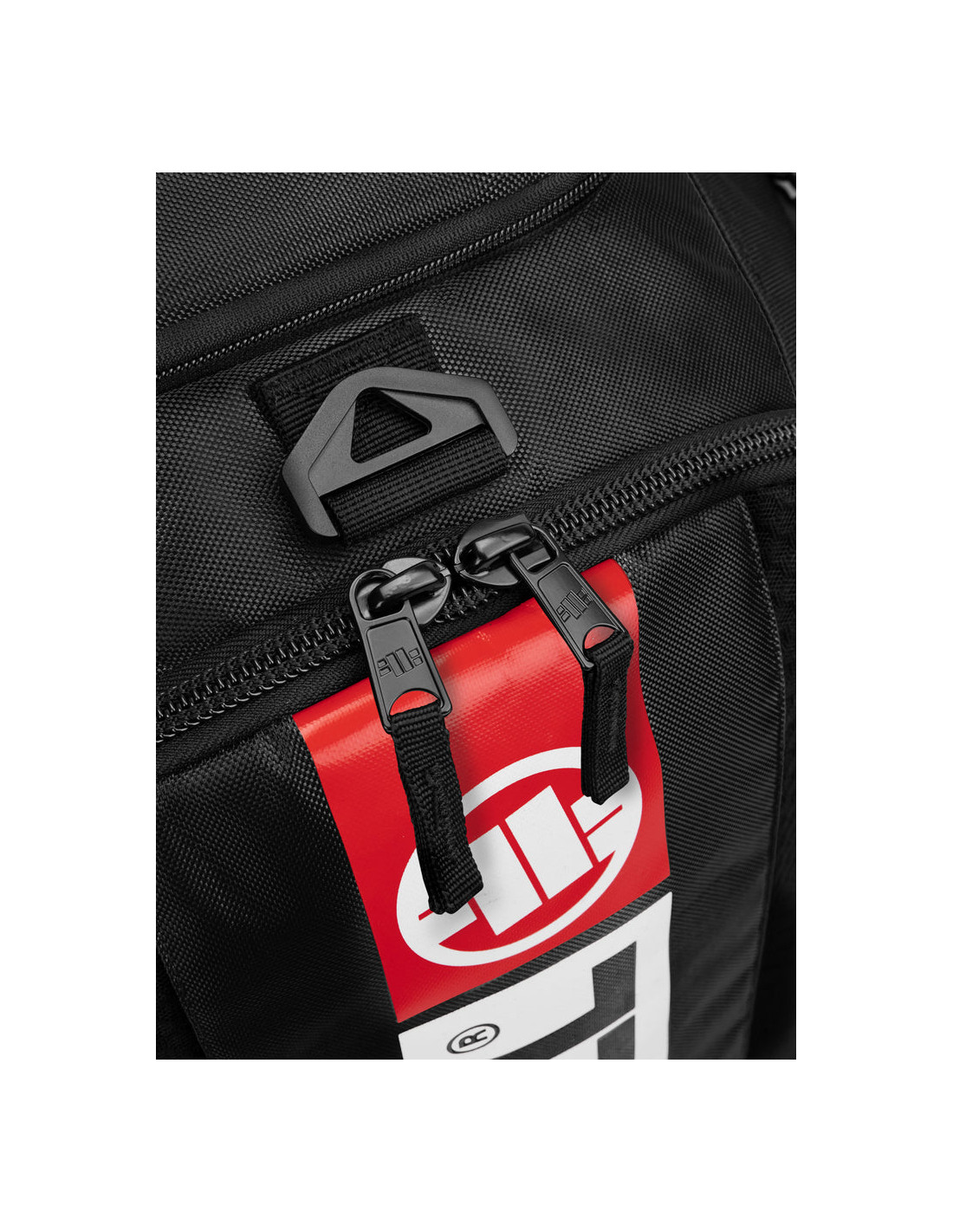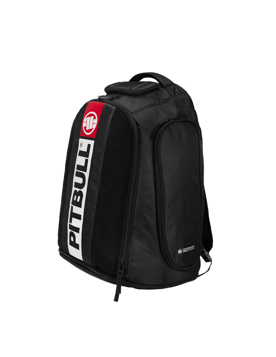• Predná časť: vertikálny kontrastný pruh – biely potlačený nápis „PITBULL“ a červené logo v hornej časti